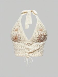 Women’s Plus Size Crochet Halter Crop Top Lace Up Backless Embroidered Hippie Boho Tank